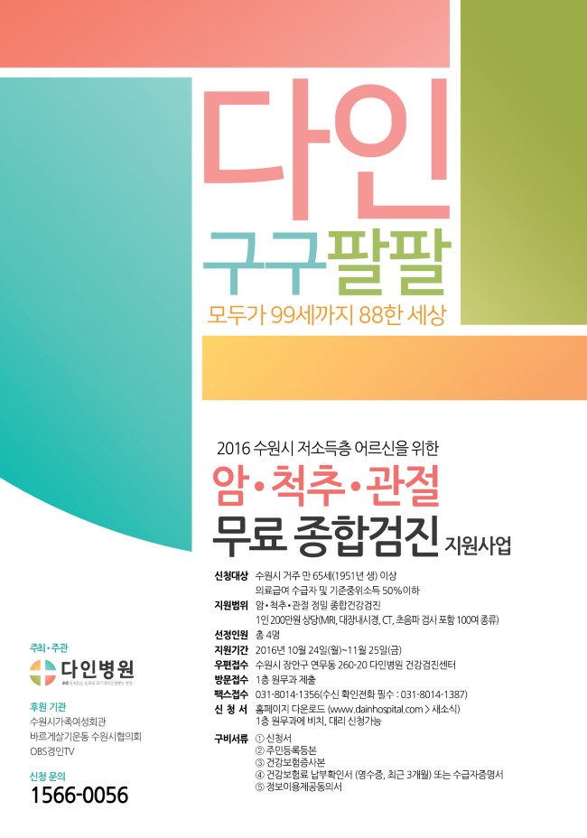 수원시 저소득층 노인을 위한 척추·관절·암 무료건강검진