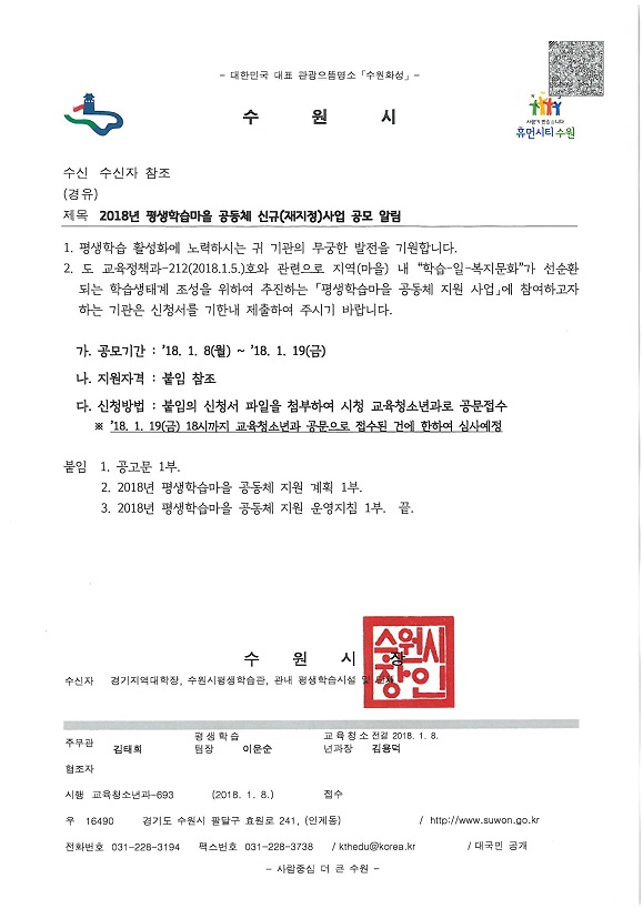 지역(마을)내 "학습-일-복지문화"가 선순환되는 학습생태계 조성을 위하여 추진하는 "평생학습마을 공동체 지원사업에 참여하고자 하는 기관은 붙임자료를 참고하셔서 2018. 1. 19.(금) 18:00까지 시청 교육청소년과로 방문제출 바랍니다.