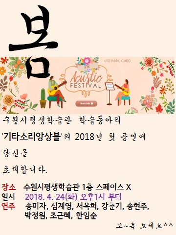 24일 화요일에는 <기타 소리 앙상블>의 연주가 진행됩니다.