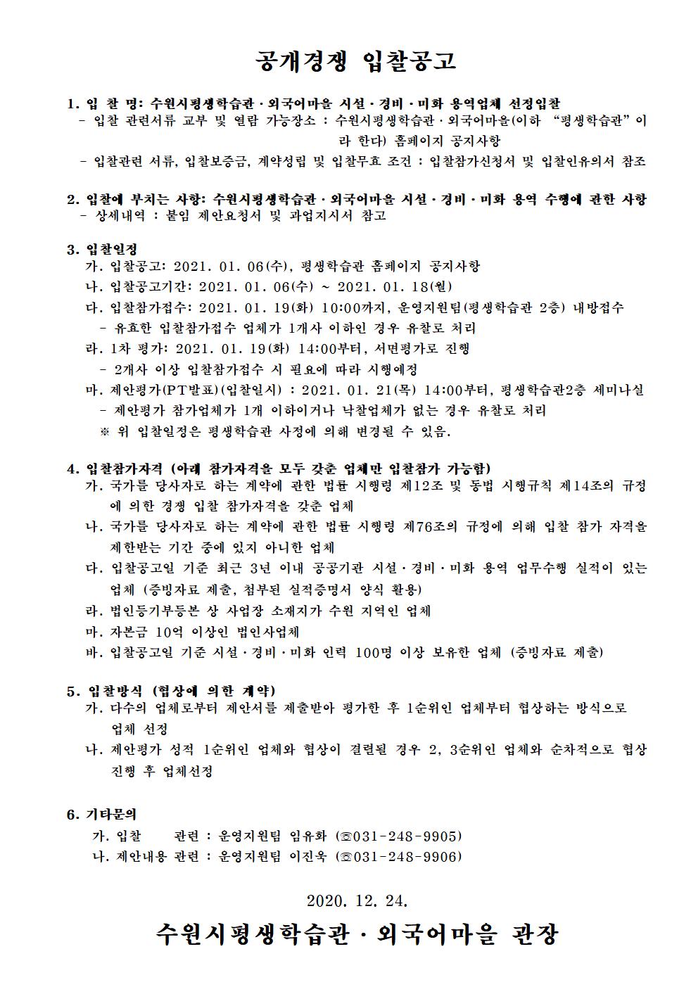 (마감)[공개경쟁 입찰공고] 수원시평생학습관ㆍ외국어마을 시설·경비·미화 용역업체 선정입찰