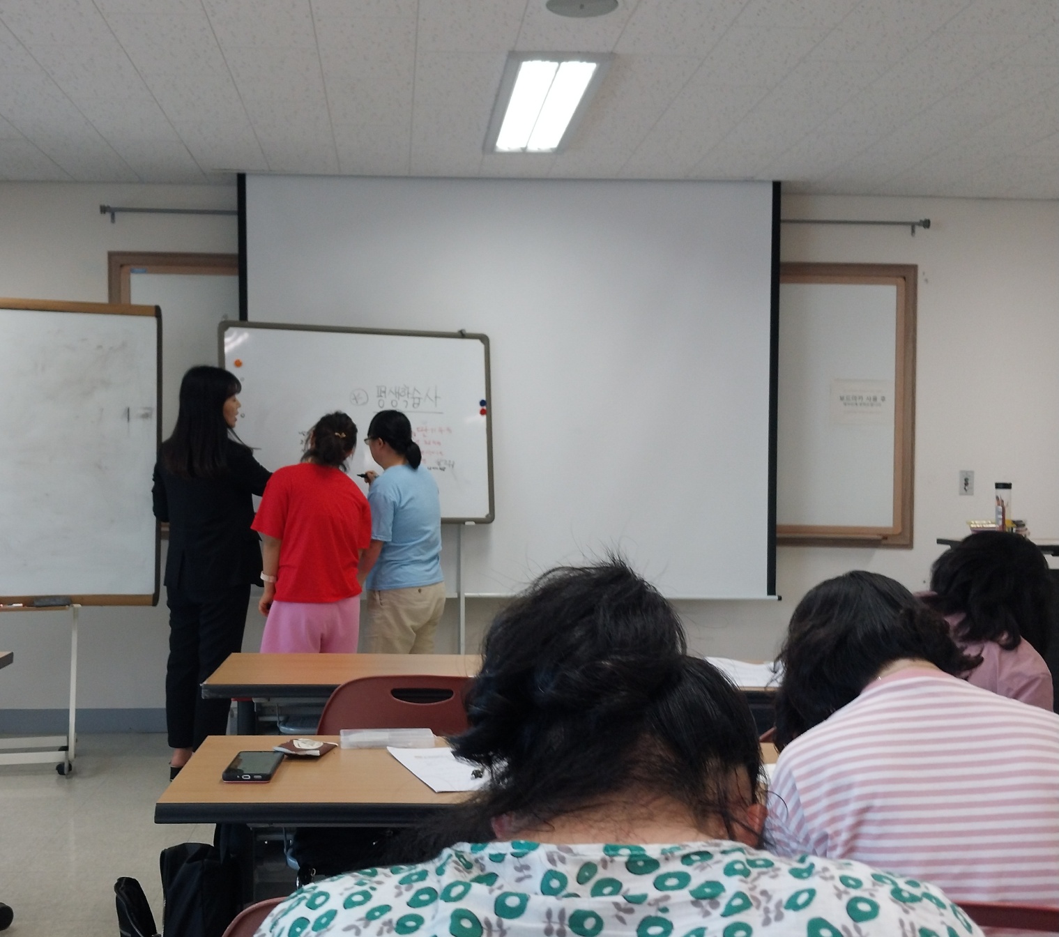 수원시 [더열린숲복지센터 사회적협동조합]기관에 채용된 직원으로 수원시평생교육학습관 어깨동무 경제교실에서 개인별 학습과 사회구성원으로 살아가면서 갖춰야 할 도덕과 기본적인 규범을 익히고 학습하는 느림학습자들이였다.