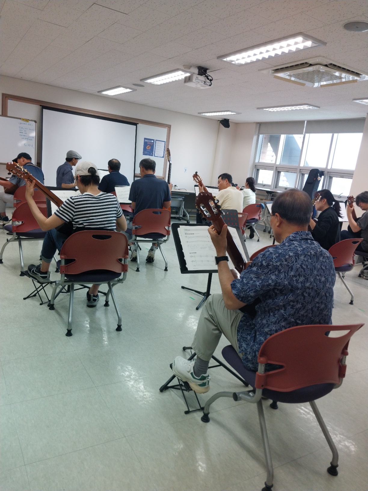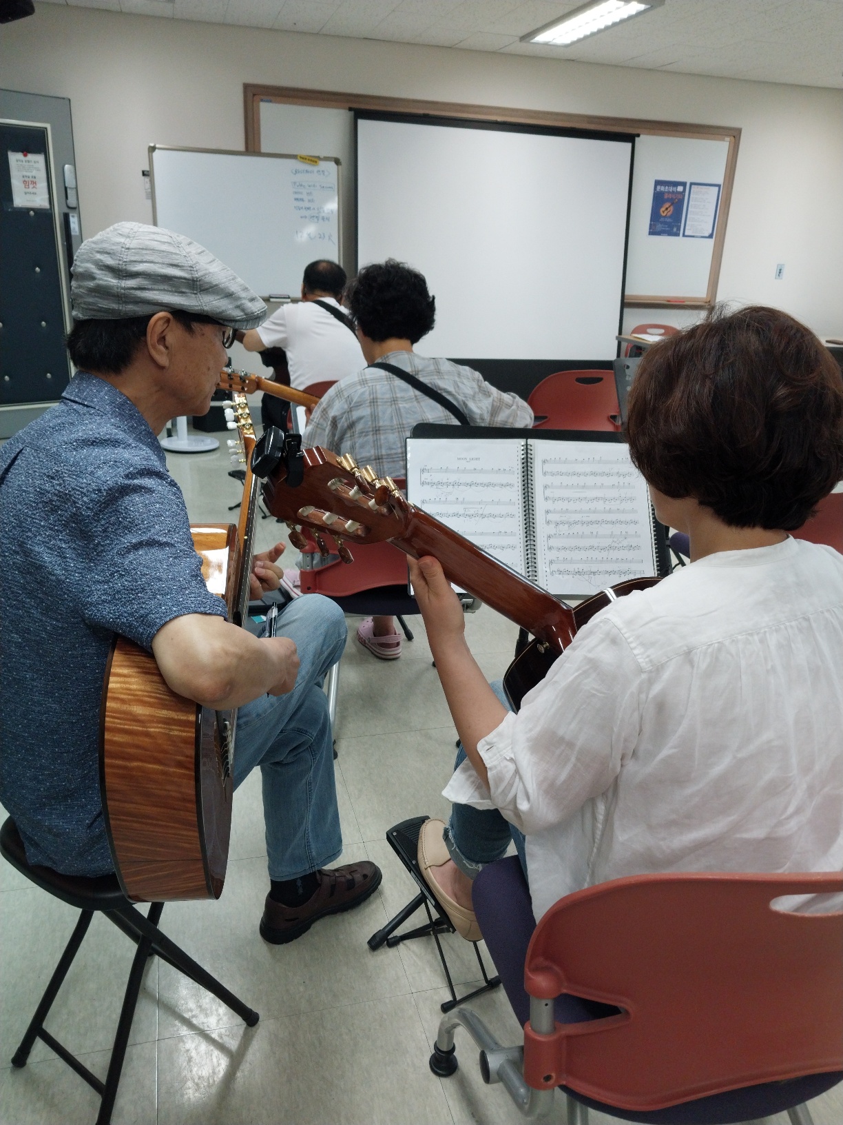 304호 강의실 소리터에 기타 발 받침대와 악보 보면대는 잘 갖추어져 있으나 대부분의 수강생들은 주차 때문에 너무 힘들다고들 토로했다.