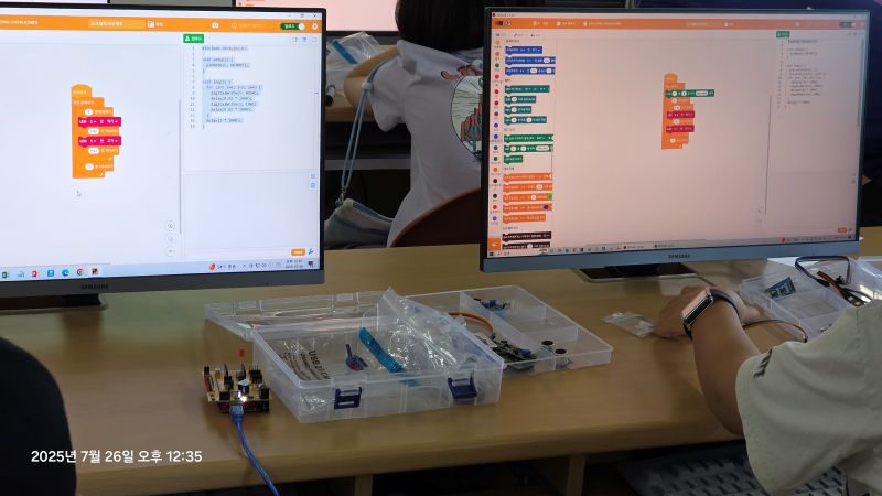 이번 수업을 통해 학생들은 블록 코딩의 기본 구조를 배우고, 아두이노 보드와 LED를 연결해 실제 작동을 구현해보는 경험을 했습니다. 처음 접하는 프로그램임에도 이전에 학습한 경험과 연관지어 적극적으로 참여했고 앞으로 진행될 센서 입력과 AI 기능 실습을 위한 기초를 다졌습니다. 강사님은 앞서 진행된 일반 성인 대상 "AI 앱 제작과 모듈형 로봇 원격제어" 수업과 비교하여 모든 이론과 실습 내용에 차별을 두지 않았습니다. 보다 쉽고 친절한 설명과 함께, 학생들 스스로 해볼 수 있도록 기다려 주며 수업을 이끌어 주었습니다.