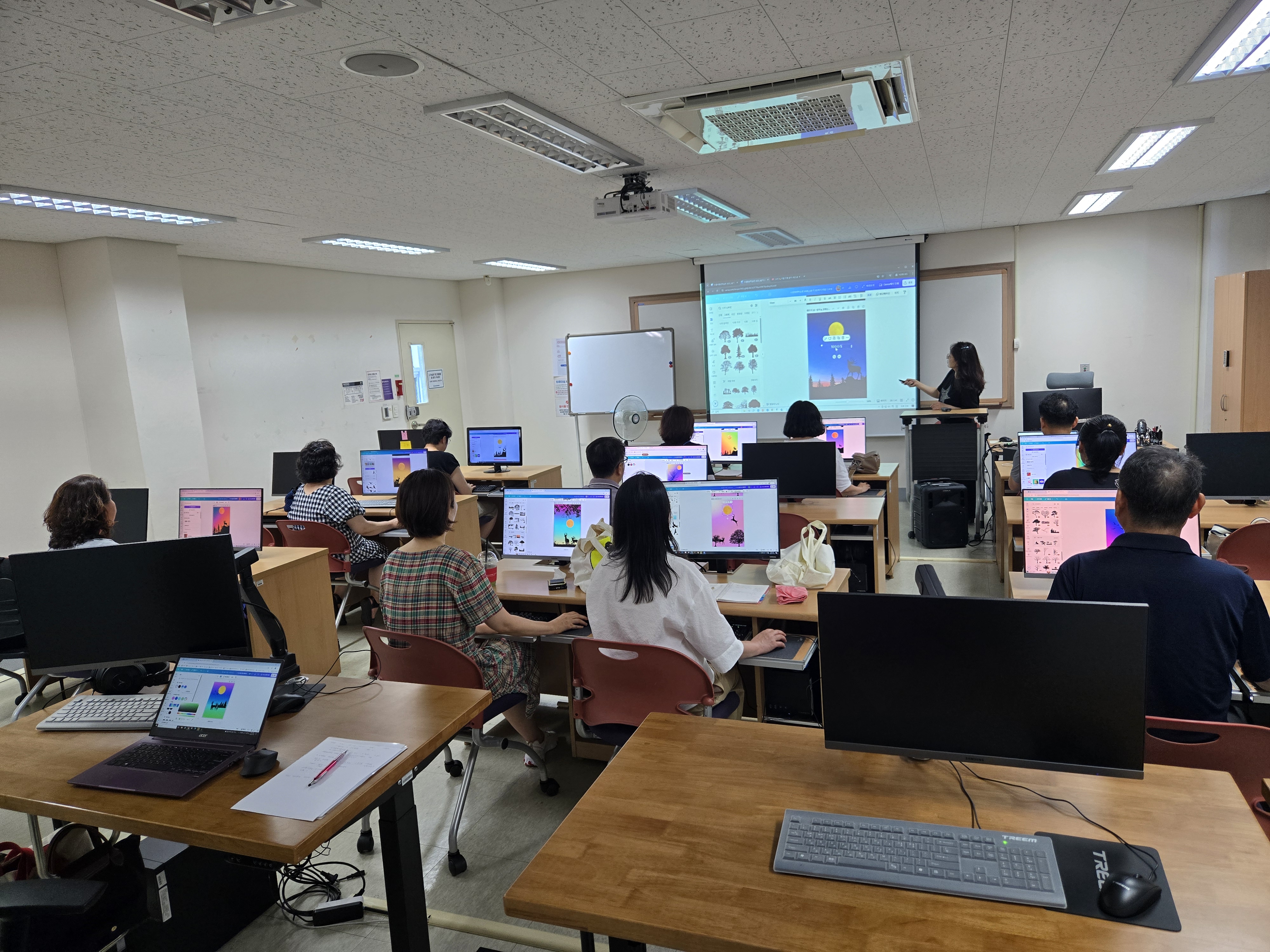 캔바가 무엇을 하는 것이지? 아마도 캔바에 대한 기초적 지식이 없이 수업을 들어도 잘 따라 할 수 있을까? 아니면 컴퓨터를 어느 정도 활용할 수 있는 사람들이 좀 더 다양하고 창의적인 작품을 만들고자 수강을 할까? 궁금하던 차에 모니터링을 위해 수업 참관을 해보니 누구나 쉽게 따라 하기엔 후자의 경우가 잘 맞는 수업이었다.