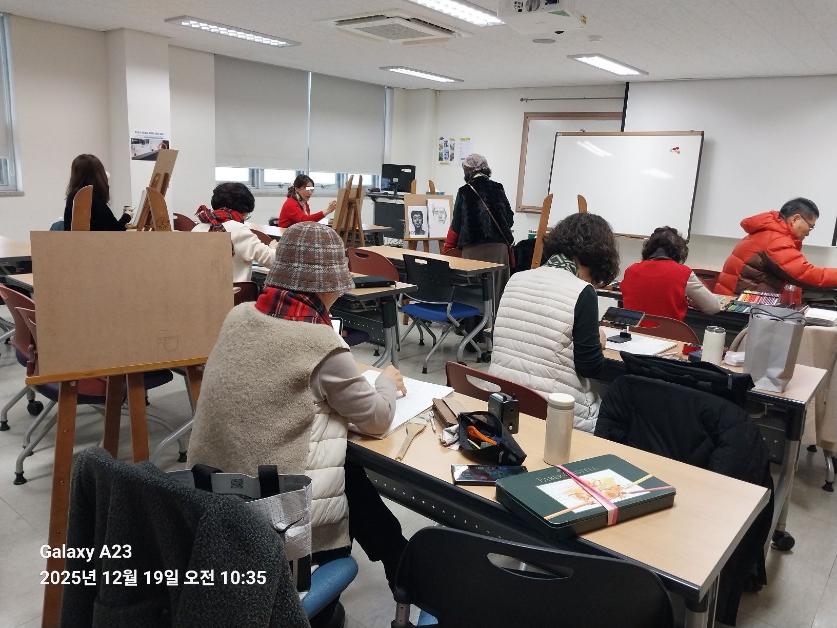 “여행&인물 스케치교실”강좌시간에 맞춰서 210호 강의실로 들어서는 수강생들은 두 손에 큼직한 가방이 들려 있었다. 지난 시간에 스케치했던 작품 및 그림도구 그리고 각자 준비한 송년다과들이었다.