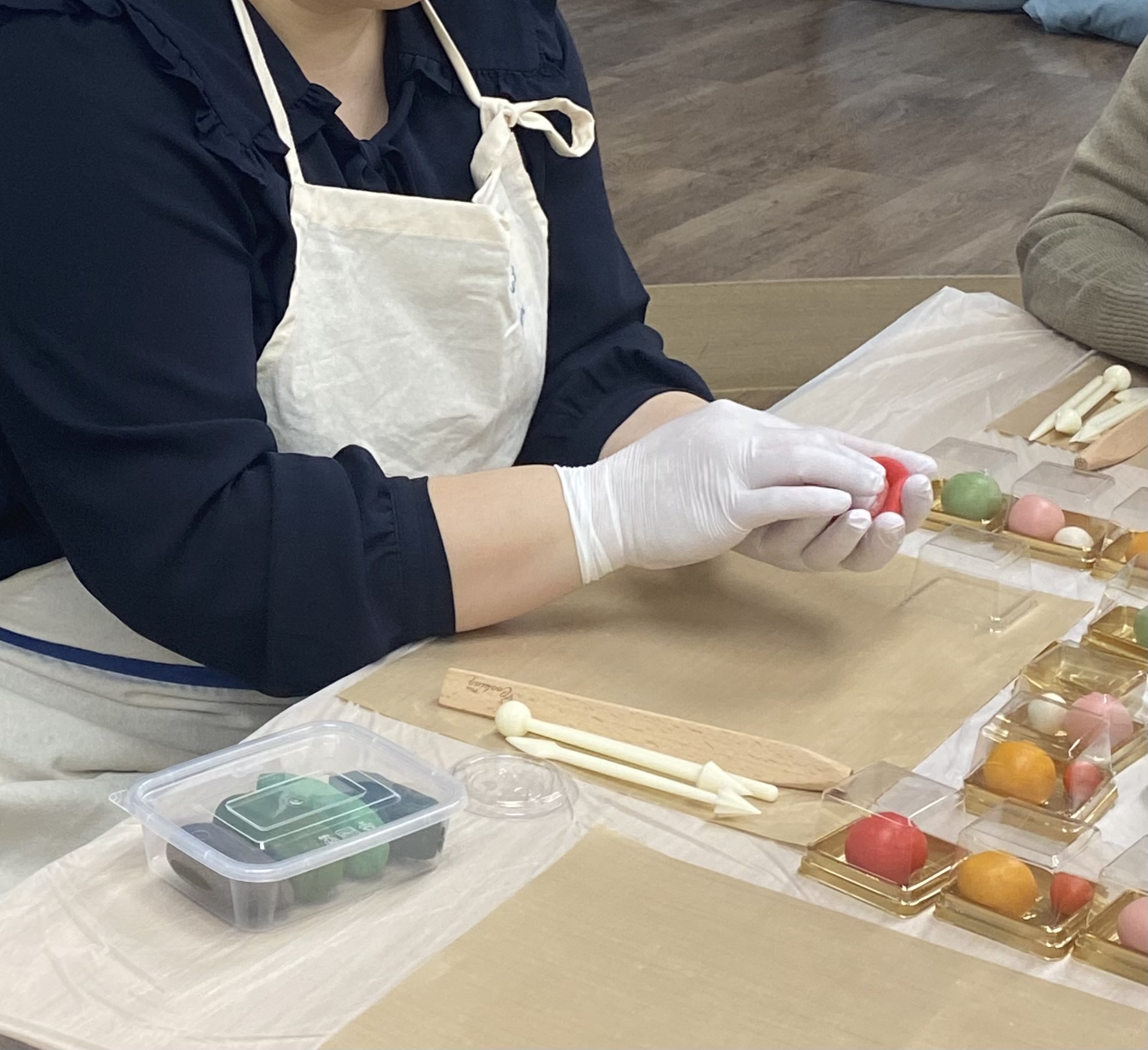 수업은 강사가 먼저 시연한 뒤 수강생들이 따라 만드는 방식으로 진행되었는데, 네 가지 화과자 중 첫 번째는 딸기 화과자였다. 딸기 특유의 둥근 형태와 끝 부분을 표현하는 포인트, 손의 힘 조절 방법 등을 중심으로 설명이 이어졌다.